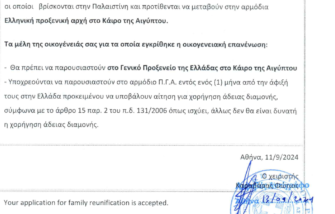 Η οικογένεια του Παλαιστίνιου Σάντι Μπαράκα δικαιούται να επανενωθεί από το 2024, όπως φαίνεται στο έγγραφο, αλλά η απόφαση δεν έχει υλοποιηθεί.
